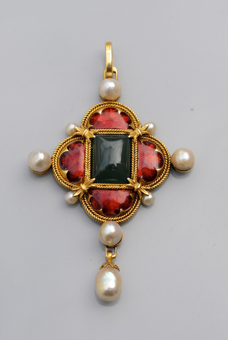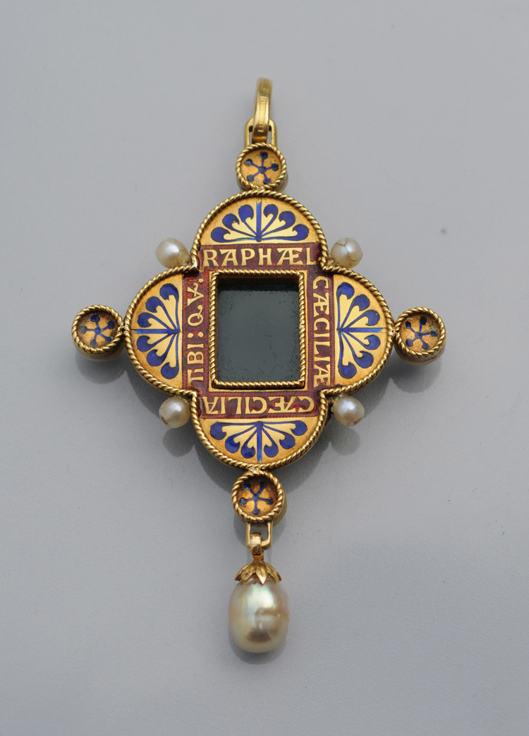 Bijzondere gouden hanger in renaissance stijl. Centraal een rechthoekige groene agaat. Het bolvormige middengedeelte bestaat uit een vierpas waarin rood translucide champlevé email, in de vier hoeken een halve oriëntparel. De onderzijde een loshangende grote barokparel. De achterzijde met ingelegd blauw en rood email de inscriptie: RAPHAEL-CAECILIAE-CAECILIA-TIBI:QV. Afm.: 7.5 X 5cm