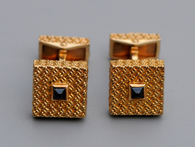 A pair of gold and sapphire cuff links designed by Boucheron. Each designed as a square golden weave surfaced panel with an cabochon cut sapphire in the centre.